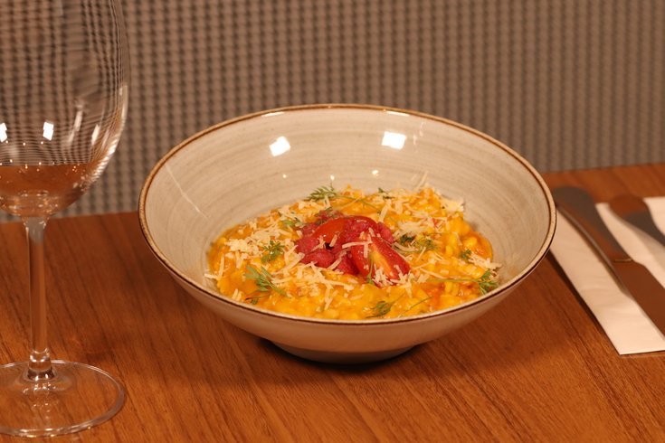 • Risotto de Abóbora com Linguiça Blumenau: Risotto de abóbora cabotiá e Linguiça Blumenau artesanal.