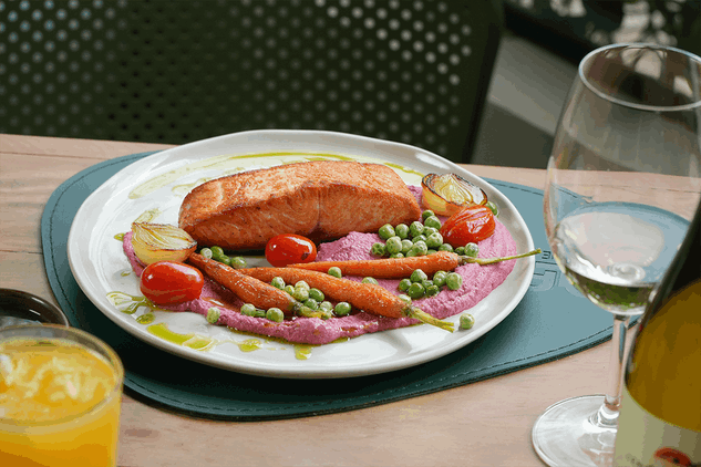 Nos pratos principais, o menu inclui opções como o Salmão Grelhado com hummus de beterraba, legumes e grão-de-bico crocante, o Fettuccine com camarão ao molho champagne e a Moqueca de Palmito, preparada com leite de coco, coentro e azeite de dendê.